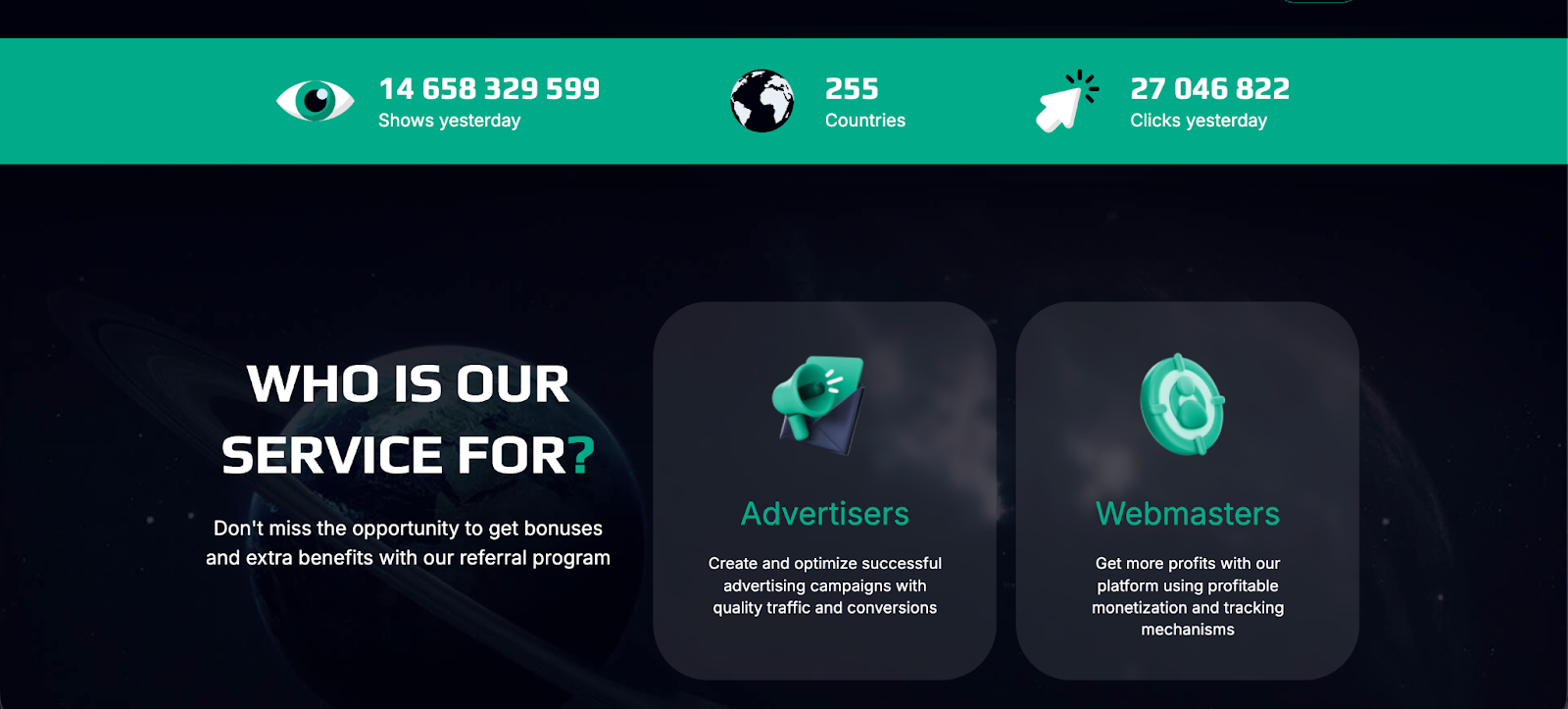 Партнерская программа: Одна из самых честных на рынке. Вы получаете 5% от спенда реферала-рекламодателя и 5% от дохода реферала-вебмастера. Привязка — пожизненная.