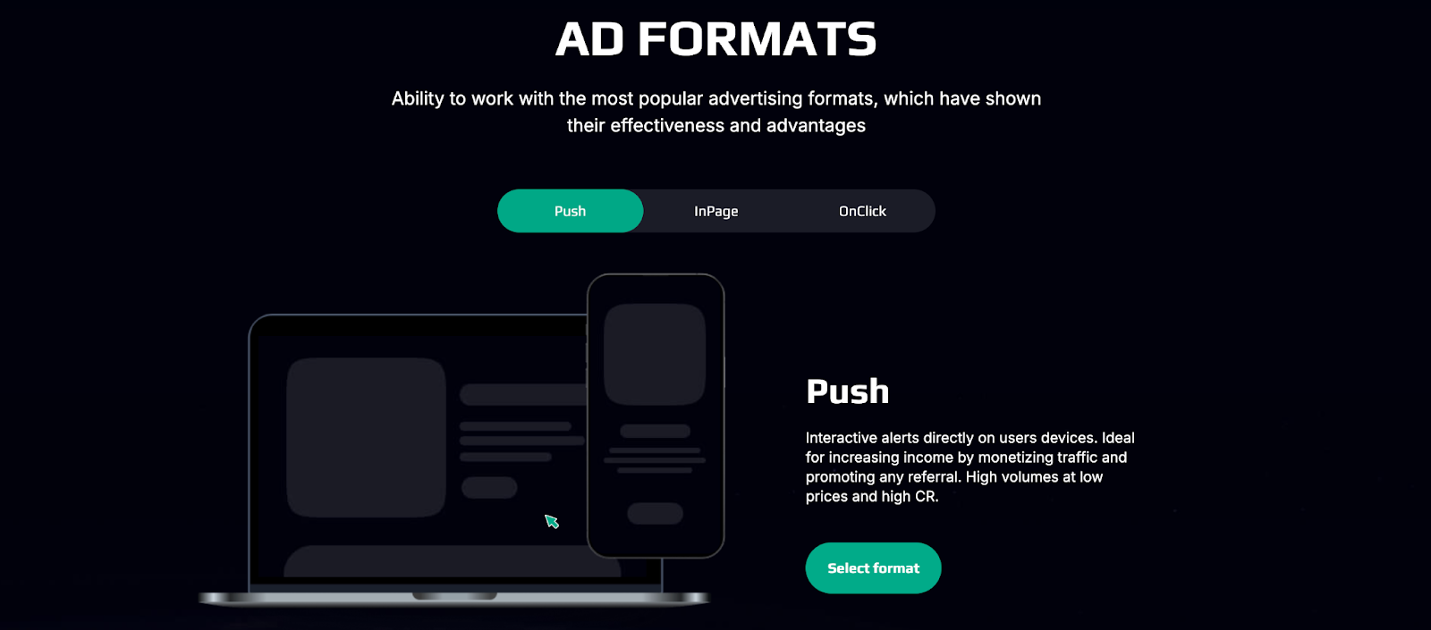 - Pop-under: Дешевый и объемный трафик для агрессивного залива. Модель закупки: Строго CPC (оплата за клик), что дает прогнозируемый результат.