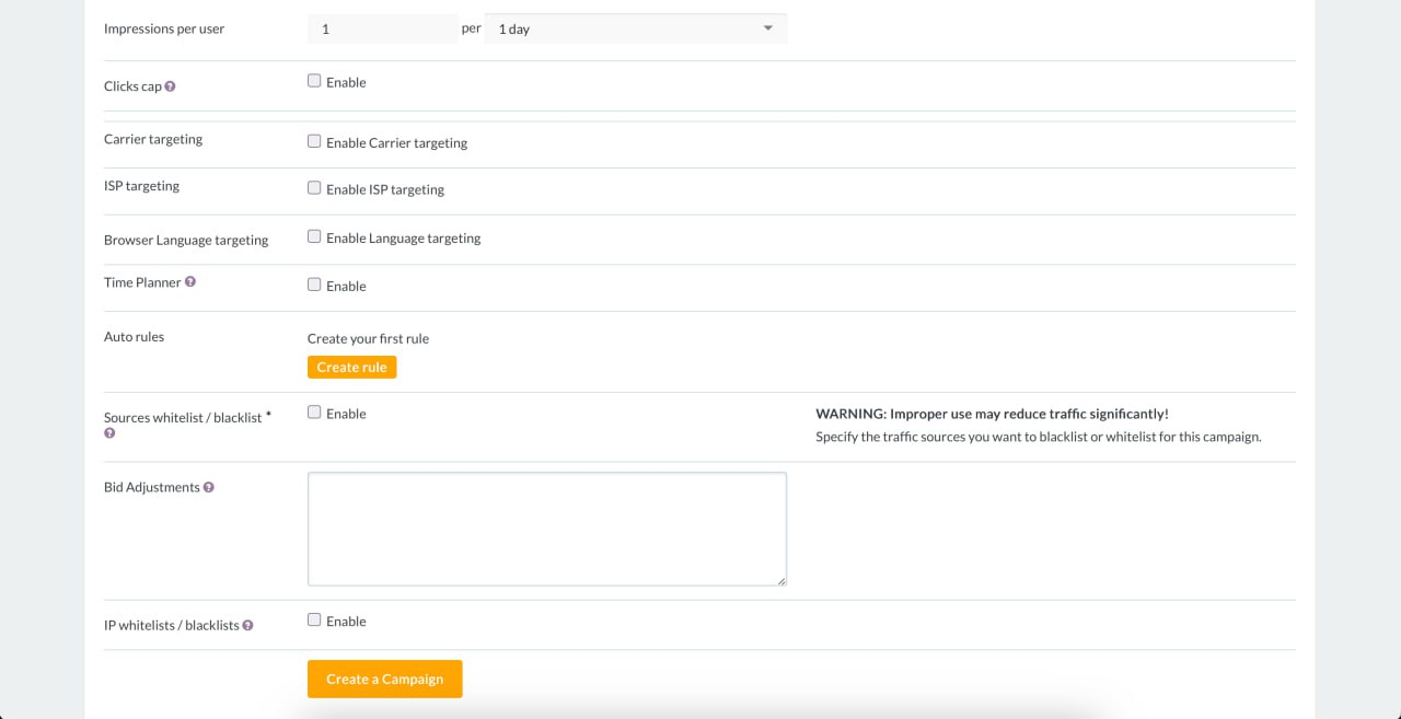 Готовые пакеты кампаний: Преднастроенные бандлы трафика под разные вертикали, которые, согласно внутренним кейсам, могут повысить эффективность до +200%.