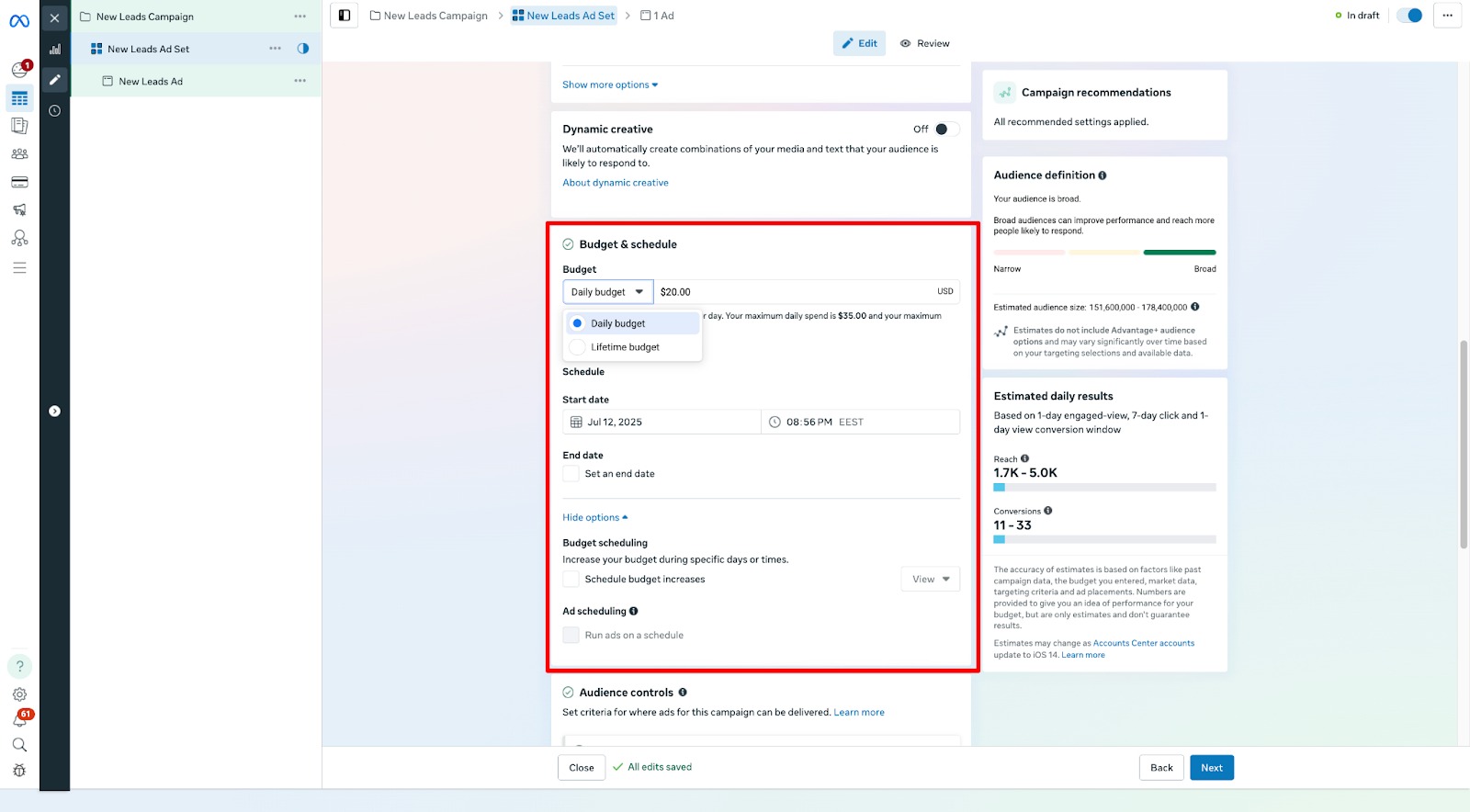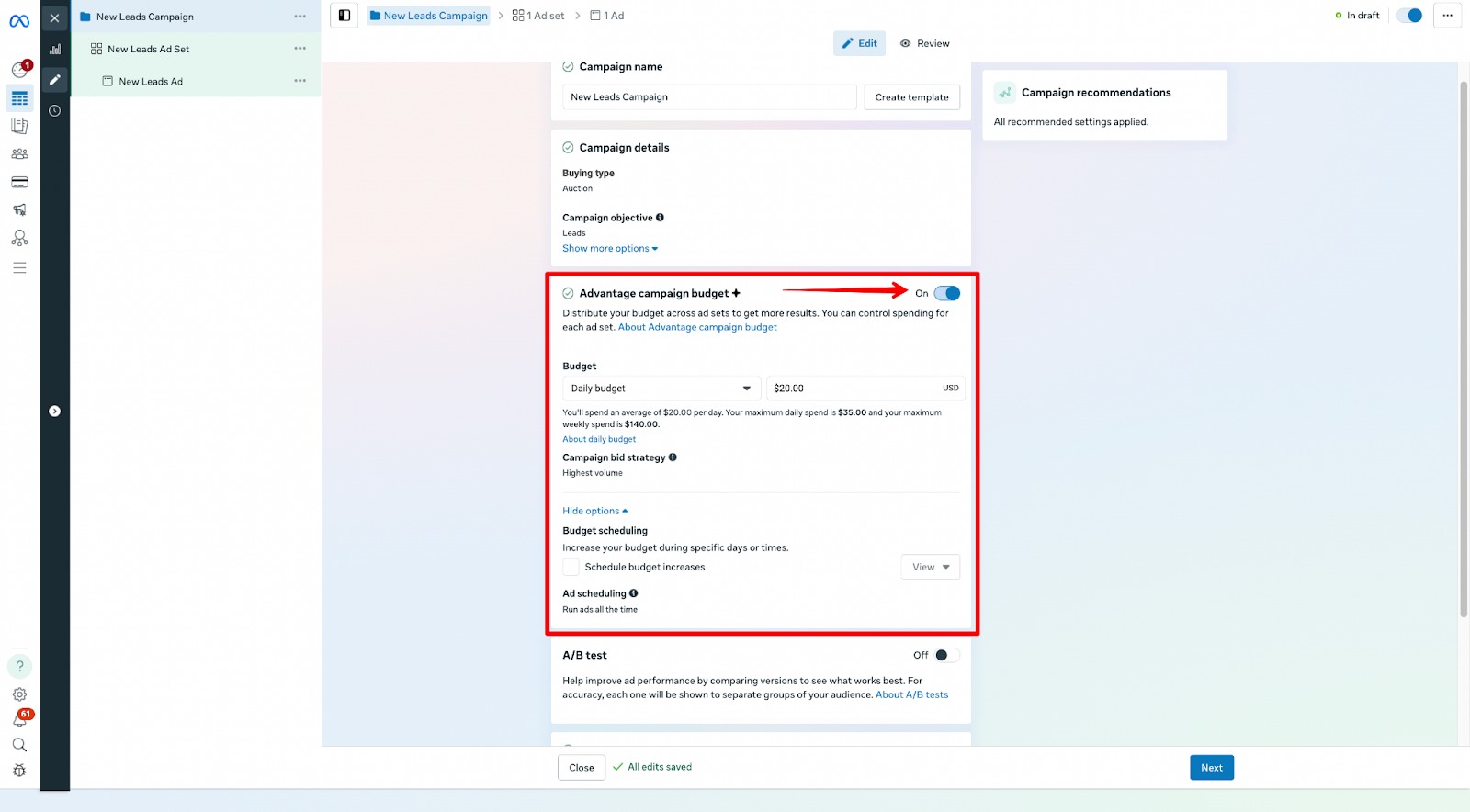 Что касается настройки бюджета рекламной кампании, Meta Ads предлагает два способа управления. На уровне адсета, когда вы вручную контролируете, сколько тратить на каждую группу. Удобно, если нужно тестировать много гипотез параллельно.