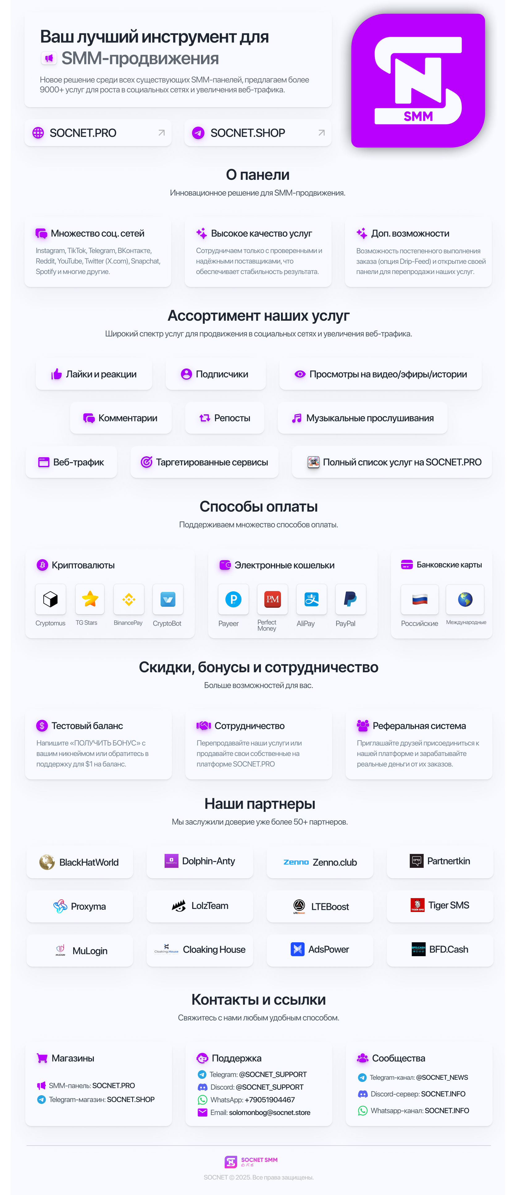 1. Промокод OCTOBER2025 (скидка 8%) на покупки в нашем магазине (Сайт, бот) в октябре! Также вы можете использовать промокод для первой покупки: SOCNET (скидка 15%)