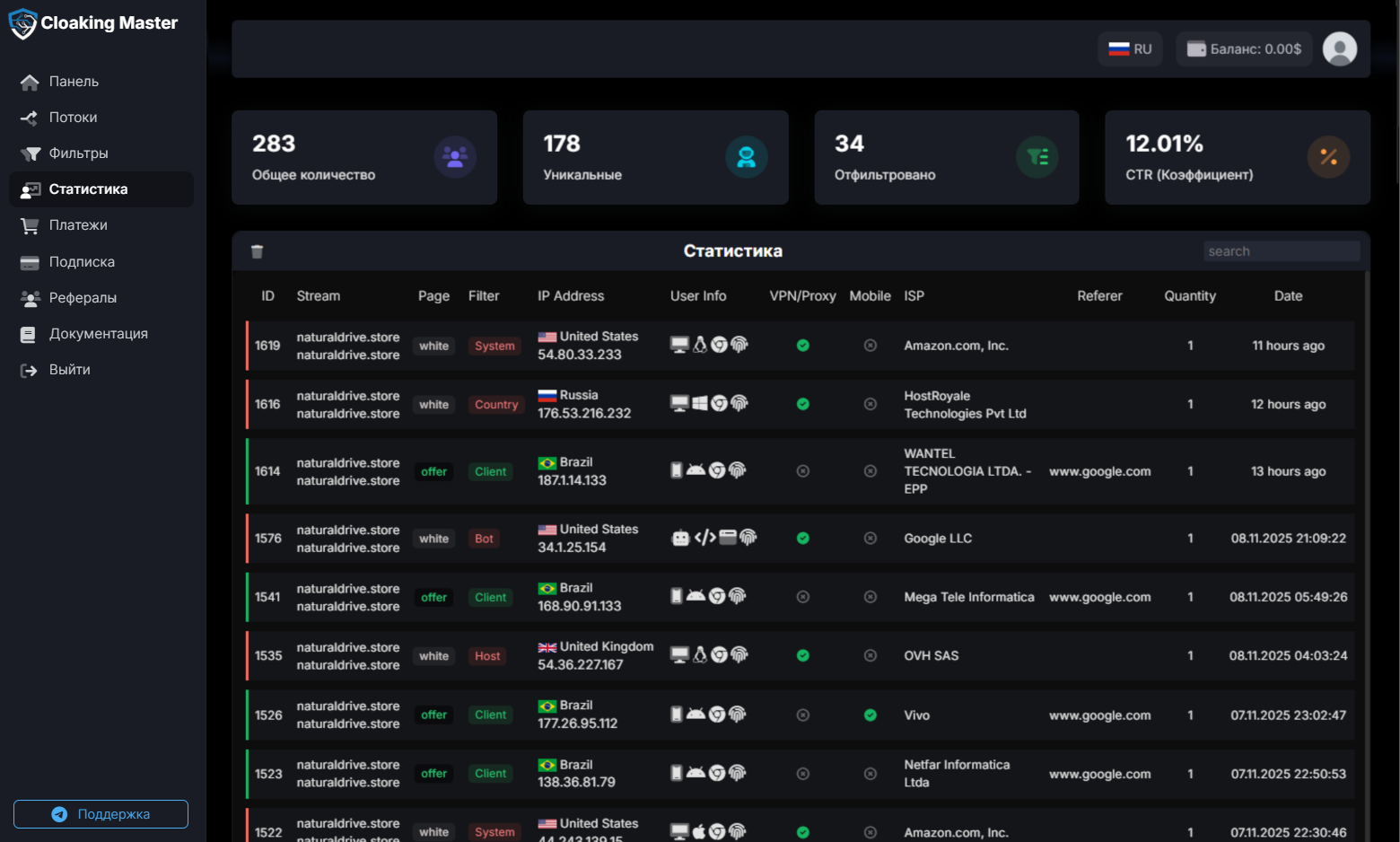Проверьте корректность отображения вашей Offer/White страницы, при правильной настройки в статистике начнут появляться посещения. Контролируйте статистику ваших потоков в разделе "Панель" и "Статистика"
