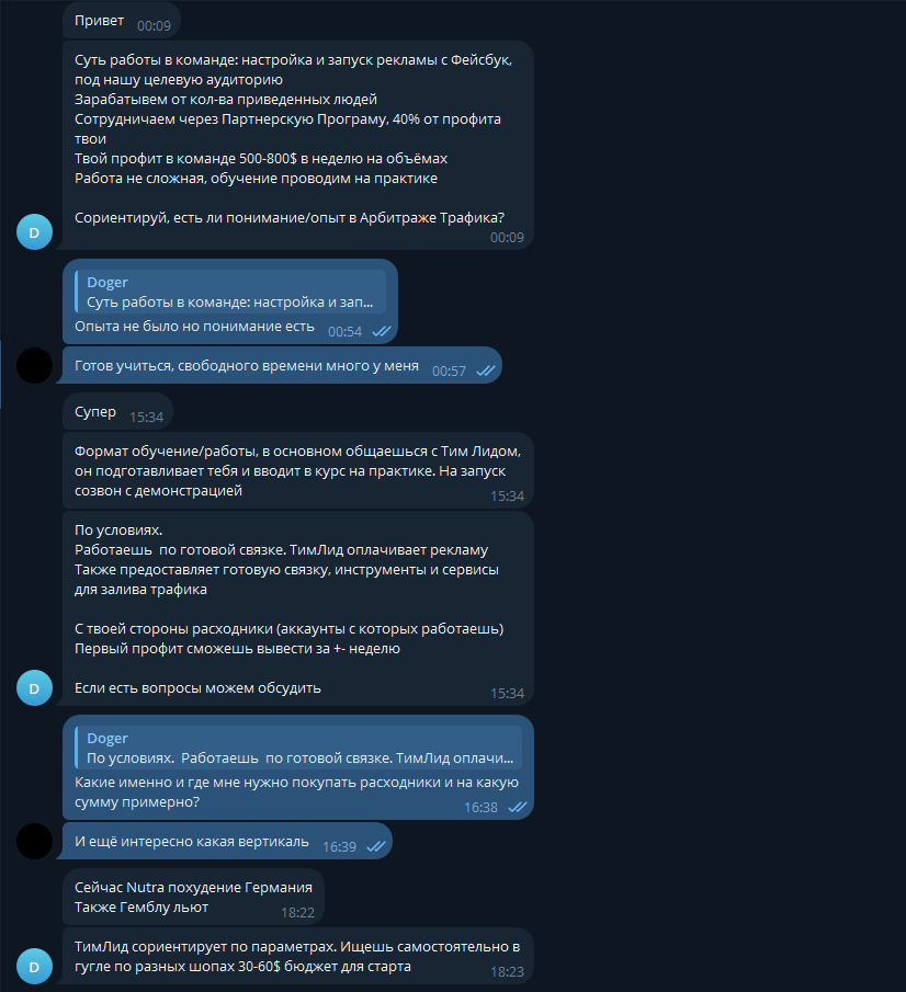 Нашёл в Telegram человека, который набирает в команду траферов Facebook. Он говорит, что обучают с нуля, тимлид даёт готовую связку, оплачивает рекламу, а с моей стороны нужны только расходники (аккаунты). По его словам, стартовый бюджет примерно 30–60$. Мне кажеться это очень странным