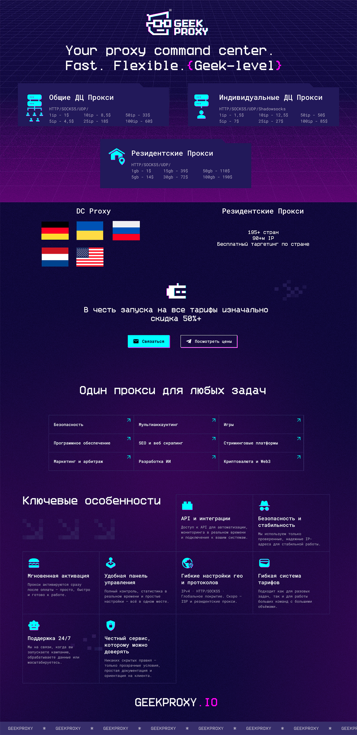 GEEKPROXY.IO прямой провайдер инфраструктуры (никакого реселлинга). Предлагаем как высокоскоростные датацентр-прокси (IPv4), так и нашу новую премиальную сеть резидентских IP.