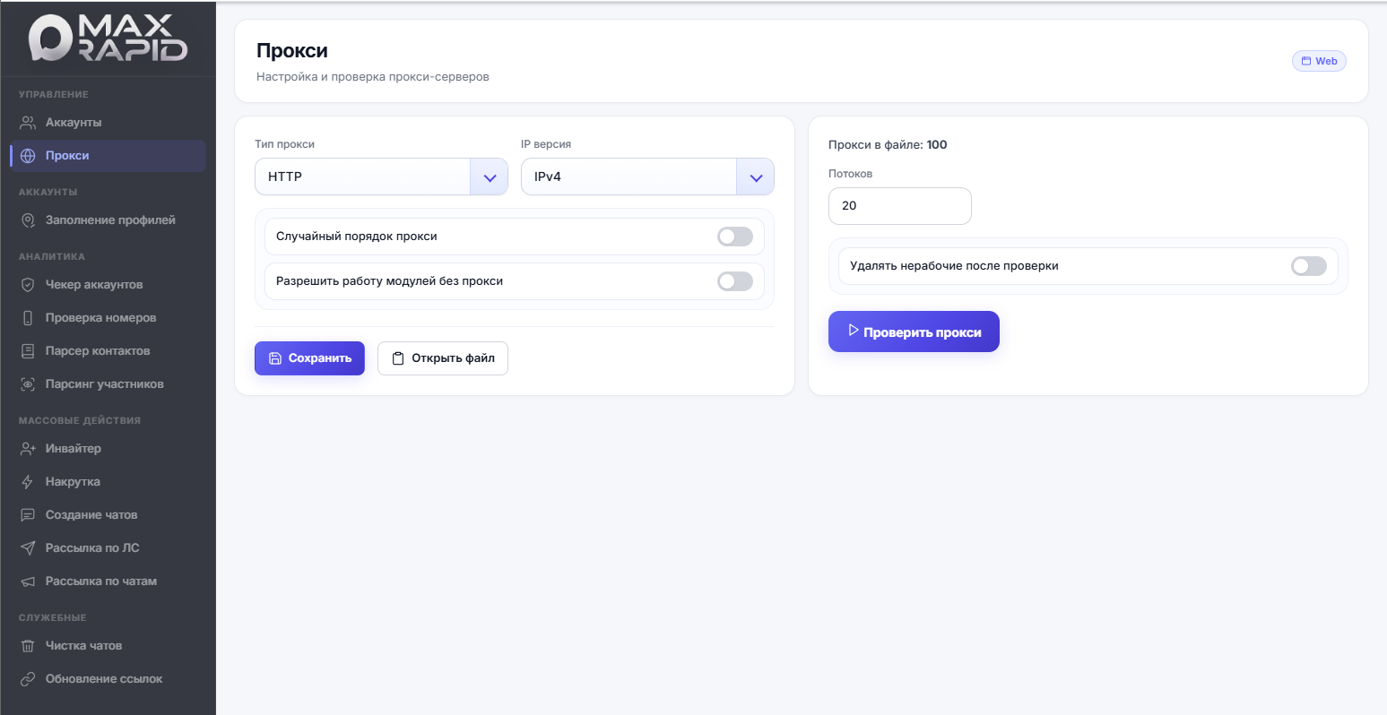 В MaxRapid работа с прокси встроена в общий контур программы. Можно задать тип прокси, IP-версию, количество потоков и запустить проверку связки, после чего оставить только те прокси, которые действительно подходят для работы. Такой подход позволяет избежать лишних ограничений и делает автоматизацию более стабильной.
