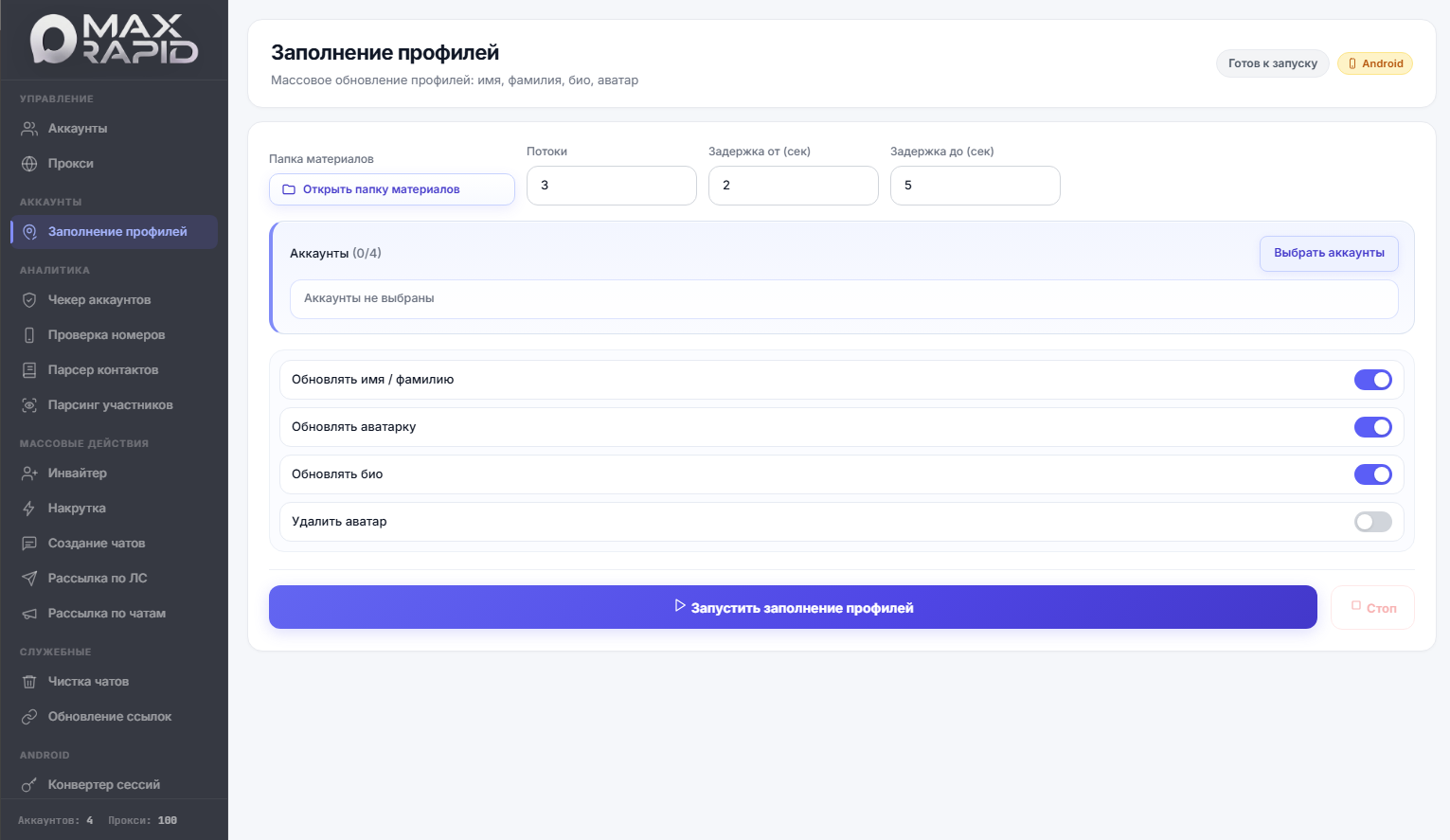 В MaxRapid для этого есть отдельный модуль заполнения профилей, который позволяет массово обновлять имя, фамилию, описание профиля и аватарки. Это помогает подготовить аккаунты к нормальной работе и делает их более естественными при взаимодействии с пользователями.