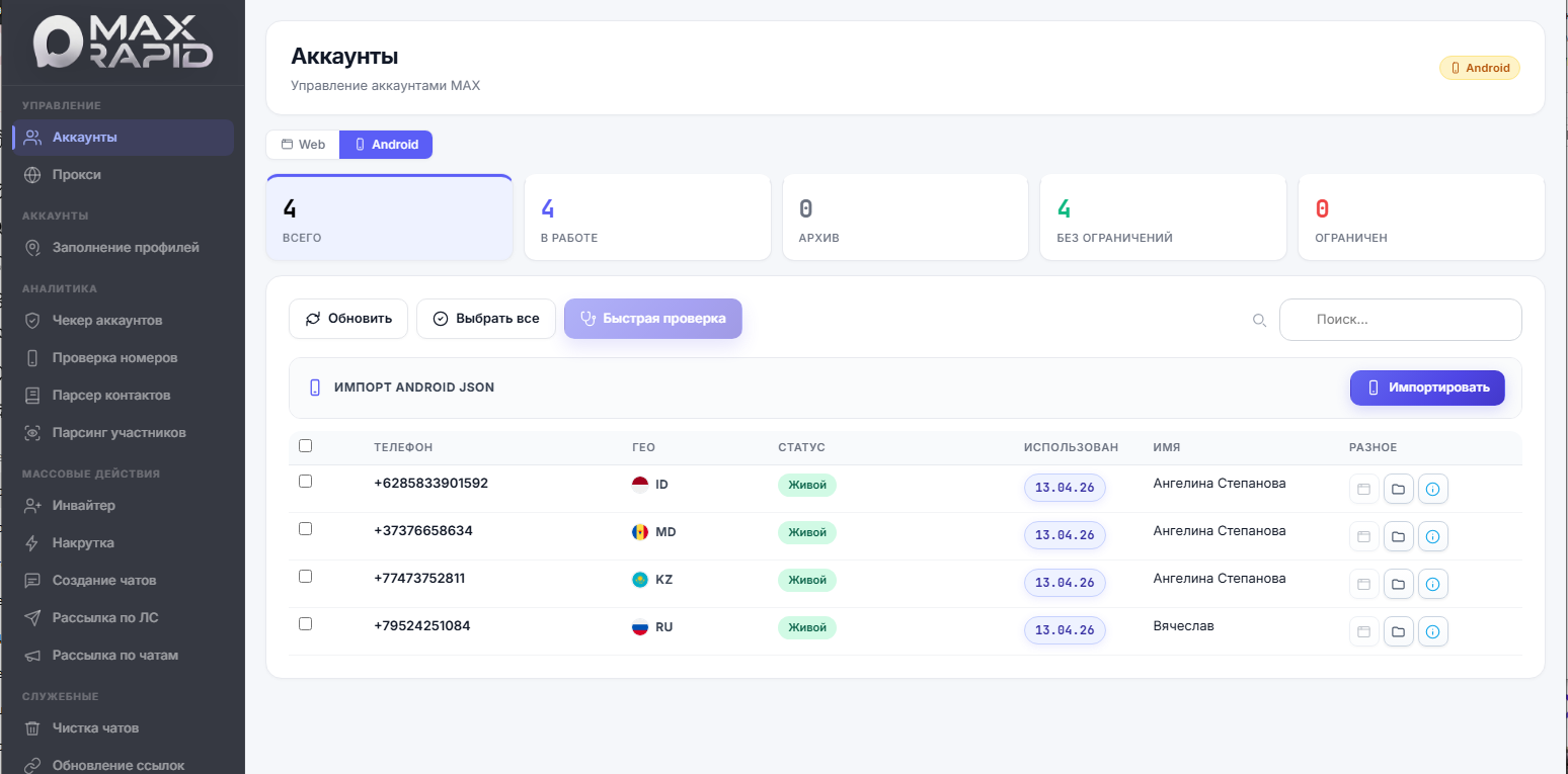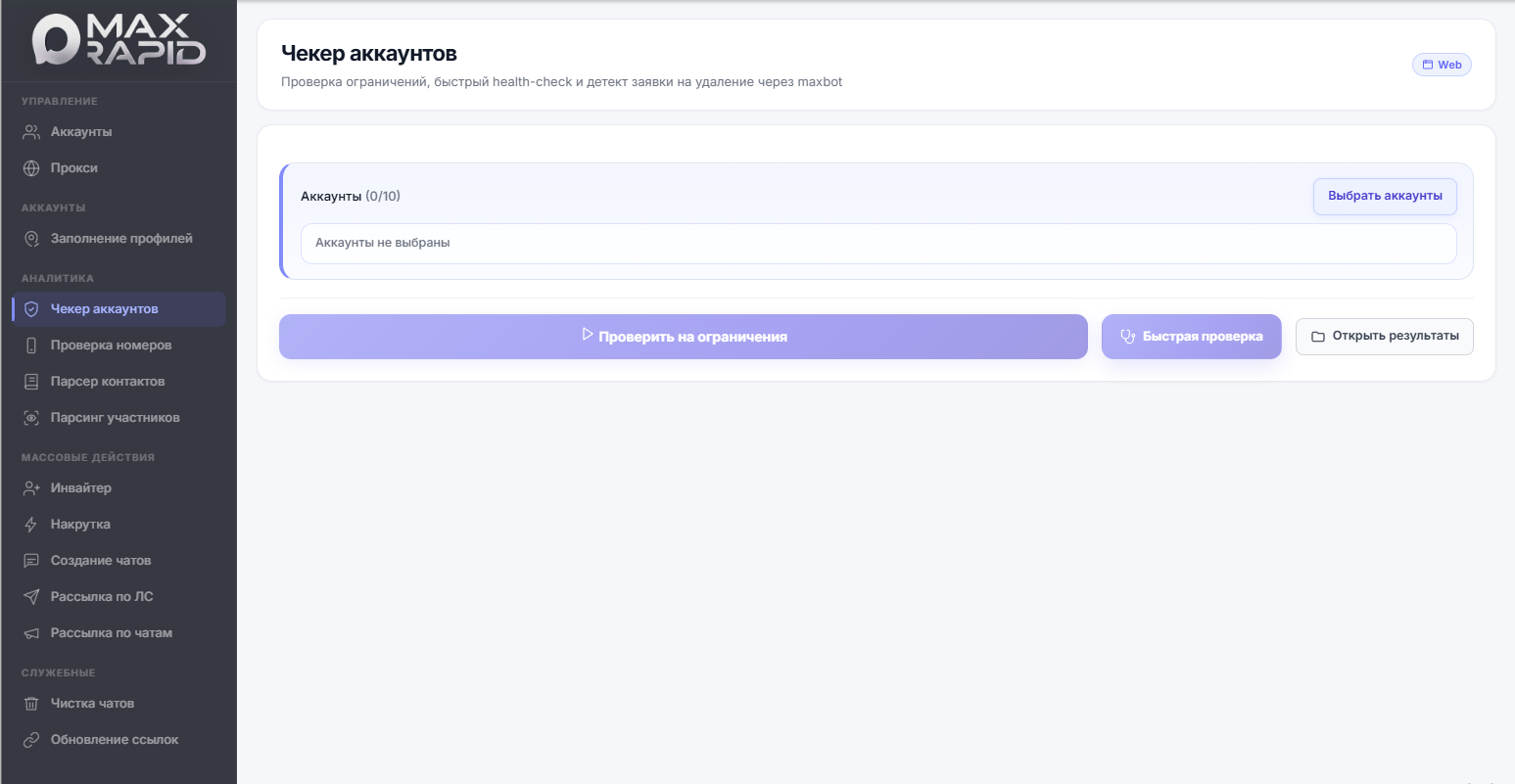 MaxRapid — это софт для системной работы с мессенджером MAX. В программе собраны основные инструменты, которые обычно используются при продвижении и работе с аудиторией. Здесь есть менеджер аккаунтов, поддержка Web и Android-сессий, проверка прокси, быстрый чек аккаунтов и проверка ограничений, парсинг участников и контактов, инвайт в чаты, рассылка сообщений, создание чатов, обновление ссылок и заполнение профилей.