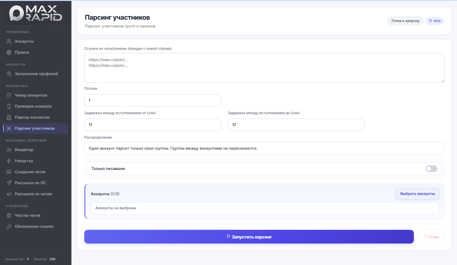В MaxRapid этот модуль позволяет собирать пользователей из чатов и каналов MAX, распределять работу между аккаунтами и использовать многопоточность. При необходимости можно включить режим «только писавшие», чтобы получать более активную аудиторию. Полученная база затем используется для приглашений в чаты, рассылок или тестирования различных гипотез.