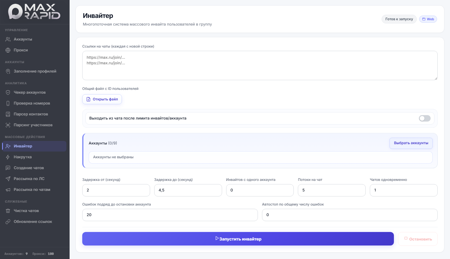 В MaxRapid инвайтер реализован как полноценный рабочий модуль. Здесь можно выбирать аккаунты, задавать лимиты и задержки, использовать потоки, контролировать количество одновременно обрабатываемых чатов и останавливать работу при возникновении ошибок. Такой подход делает процесс приглашений более управляемым и предсказуемым.