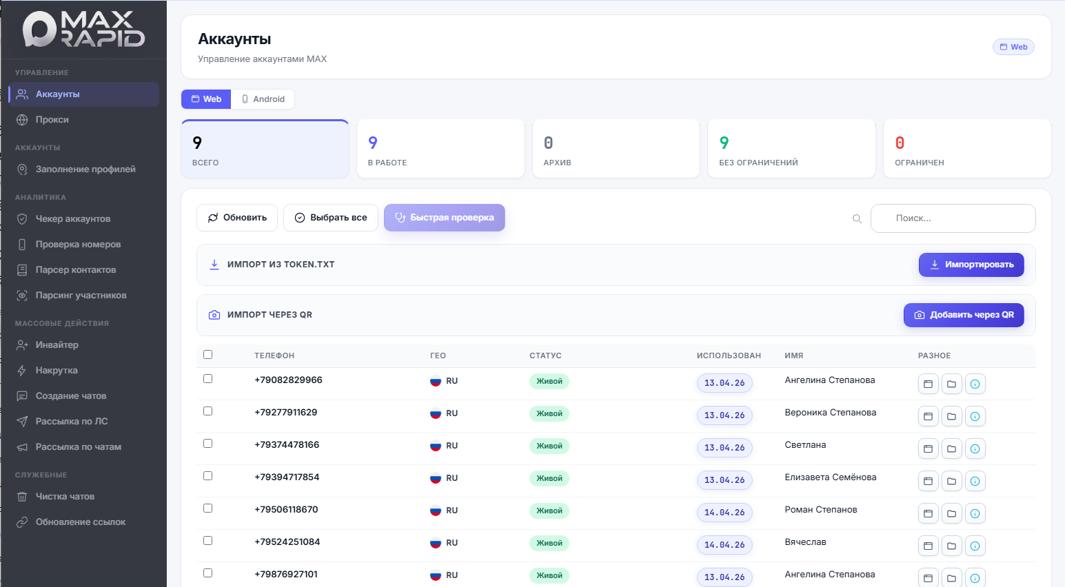 MaxRapid подойдёт тем, кто хочет работать с MAX не вручную и не хаотично, а системно и быстро. Программа позволяет держать под контролем аккаунты, проверять их состояние, собирать аудиторию, запускать приглашения и рассылки, оформлять профили и использовать как Web, так и Android-аккаунты. В результате MAX может превращаться в полноценный источник трафика, аудитории и клиентов.