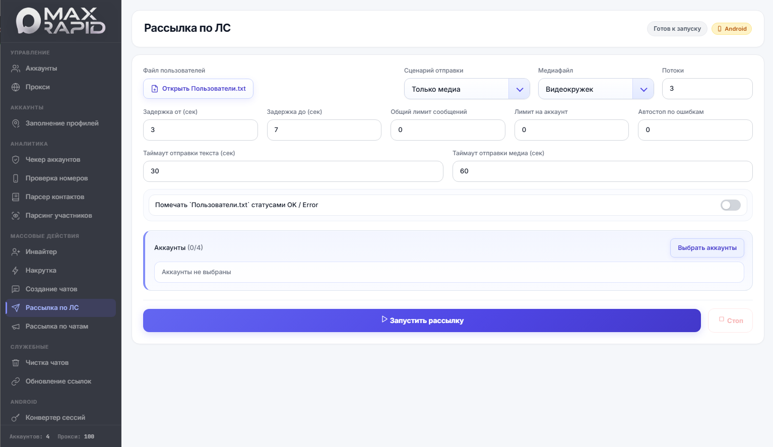 В MaxRapid модуль рассылки позволяет работать по готовым базам пользователей, отправлять текстовые сообщения, использовать медиафайлы или делать репосты. При этом можно настраивать потоки, задержки и лимиты, а также отслеживать статусы отправки, чтобы понимать как проходит процесс. Для арбитражников это быстрый способ выйти на аудиторию, для SMM-специалистов — инструмент запуска коммуникации, а для бизнеса — возможность быстрее переводить пользователей в диалог.