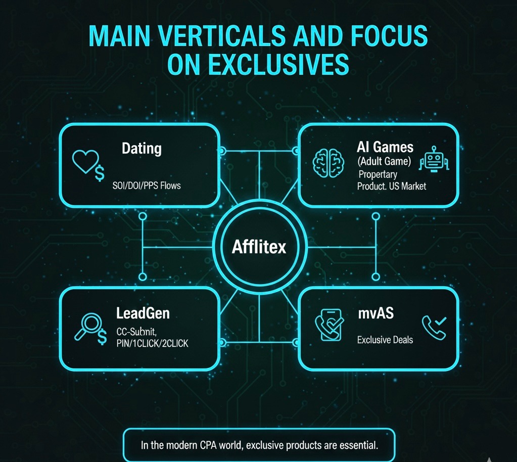Affilitex позиционирует себя как мультивертикальная партнерская программа с глобальным охватом, работающая в нишах с высокой маржинальностью и быстрой конверсией: