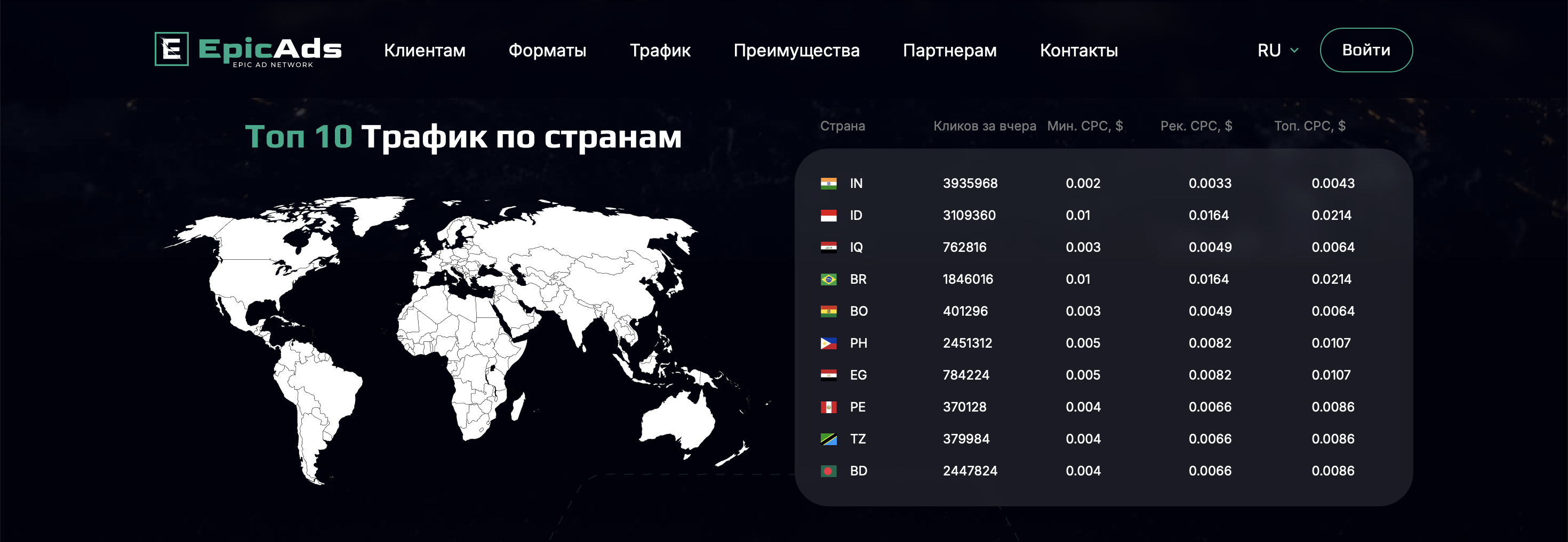 Великі обсяги трафіку зосереджені в Азії, Африці та Латинській Америці. Тут telehealth активно зростає через обмежений доступ до традиційної медицини. EpicAds дає змогу працювати з цим попитом безпосередньо, отримуючи дешевий трафік із середньою вартістю за клік (CPC) $0,005–0,02. Завдяки цьому ці геозони швидше дають перші конверсії та краще масштабуються.