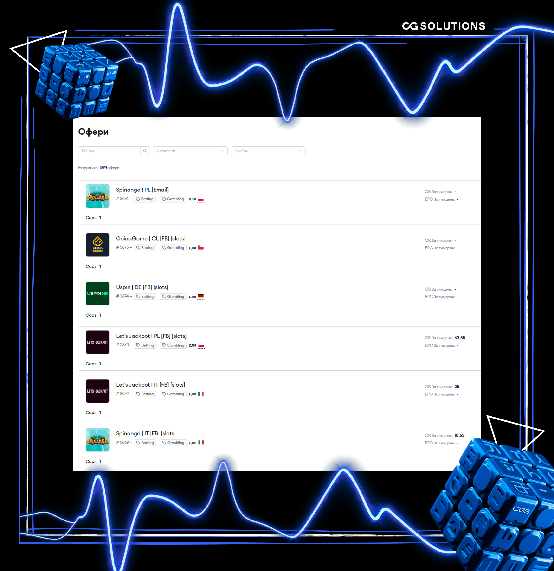 Огляд CG SOLUTIONS: iGaming-партнерська програма з ексклюзивними оферами, CPA-моделлю та фокусом на Tier-1 GEO