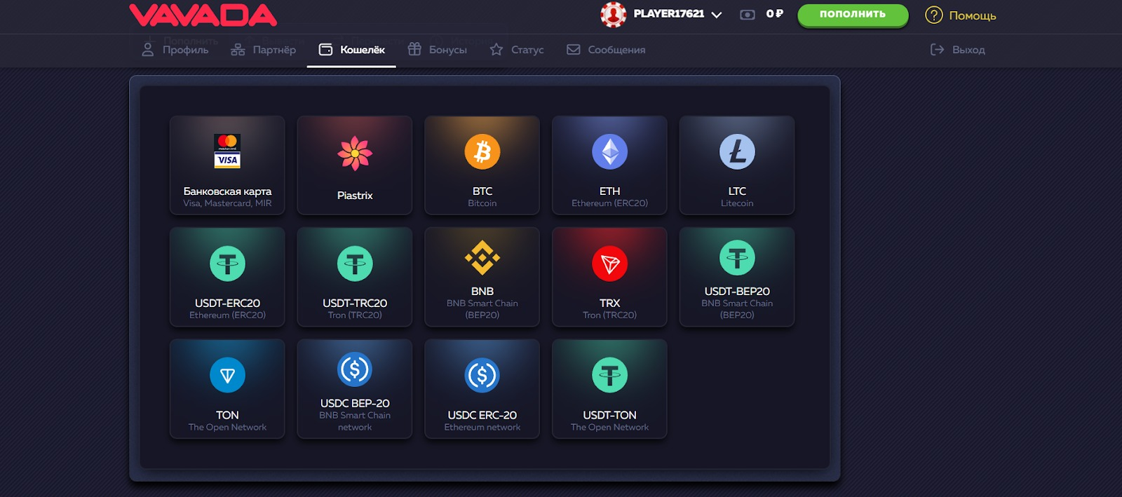 Головна перевага Vavada — мінімальний поріг входу. Гравці можуть поповнити рахунок лише від 0,50$ і одразу розпочати гру. Для виведення коштів не потрібна обов’язкова верифікація, що підвищує конверсію. Поповнити баланс можна з банківських карток, електронних гаманців та криптовалютних сервісів.