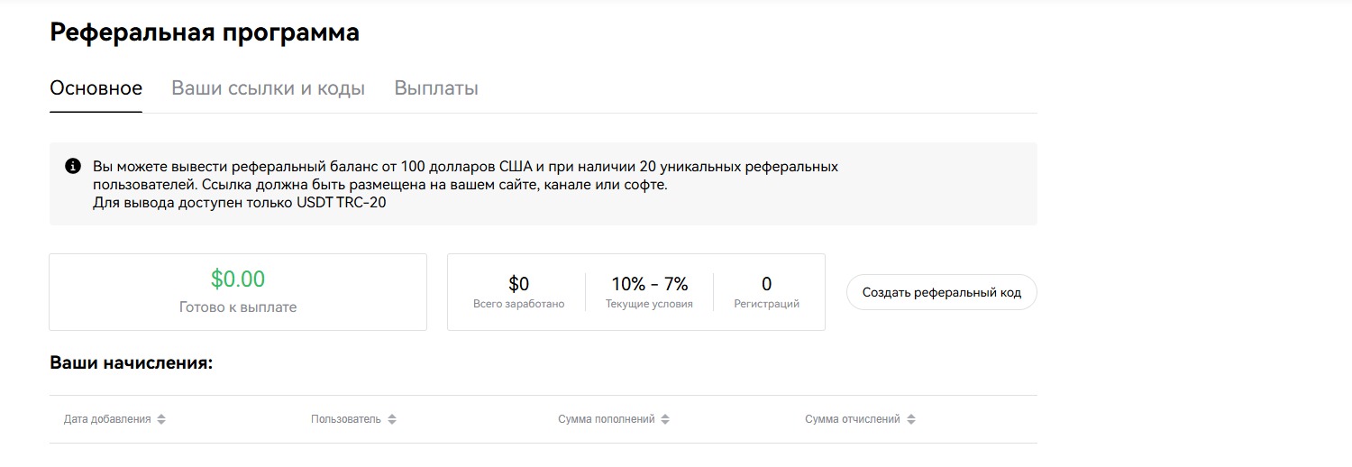 Як працює програма? Ви отримуєте реферальне посилання та розміщуєте його на своєму сайті, у каналі або в софті. За кожного залученого користувача нараховується відсоток із його платежів. Виплати доступні при досягненні порога $100 та наявності 20 унікальних рефералів.